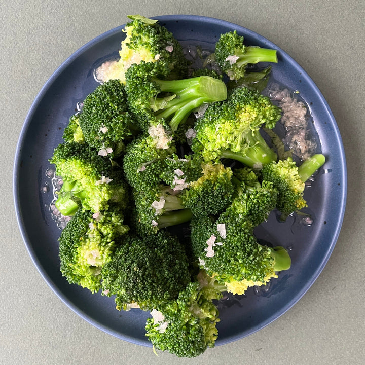 Lightly steamed broccoli with a lemony, gingery, shallot vinaigrette on the side. A most versatile side that is easy to mix and match into your routine all week long!