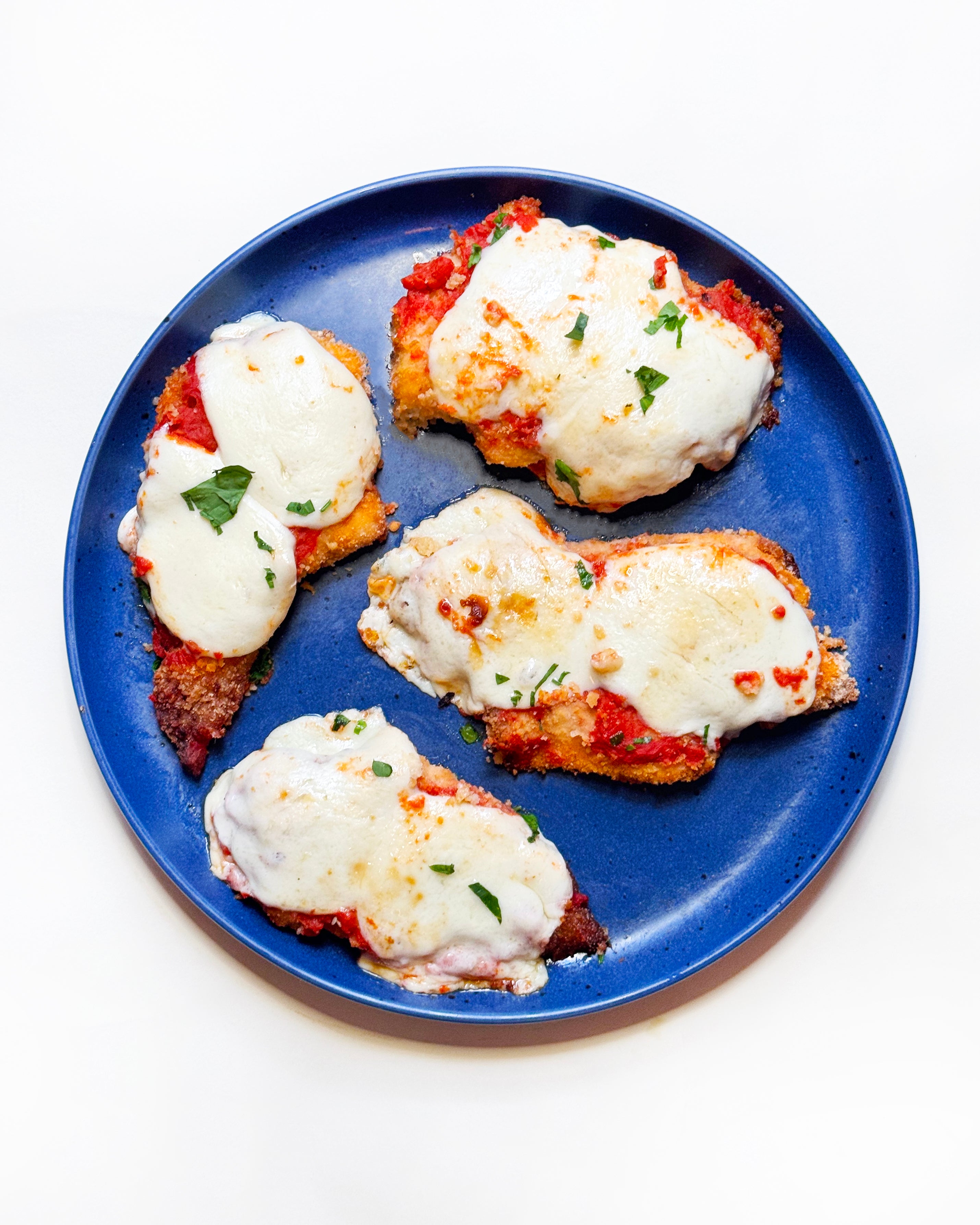 Our lighter take on the classic with baked gluten free panko-crusted chicken breast, cherry tomato sauce, and slices of melty fresh mozzarella.