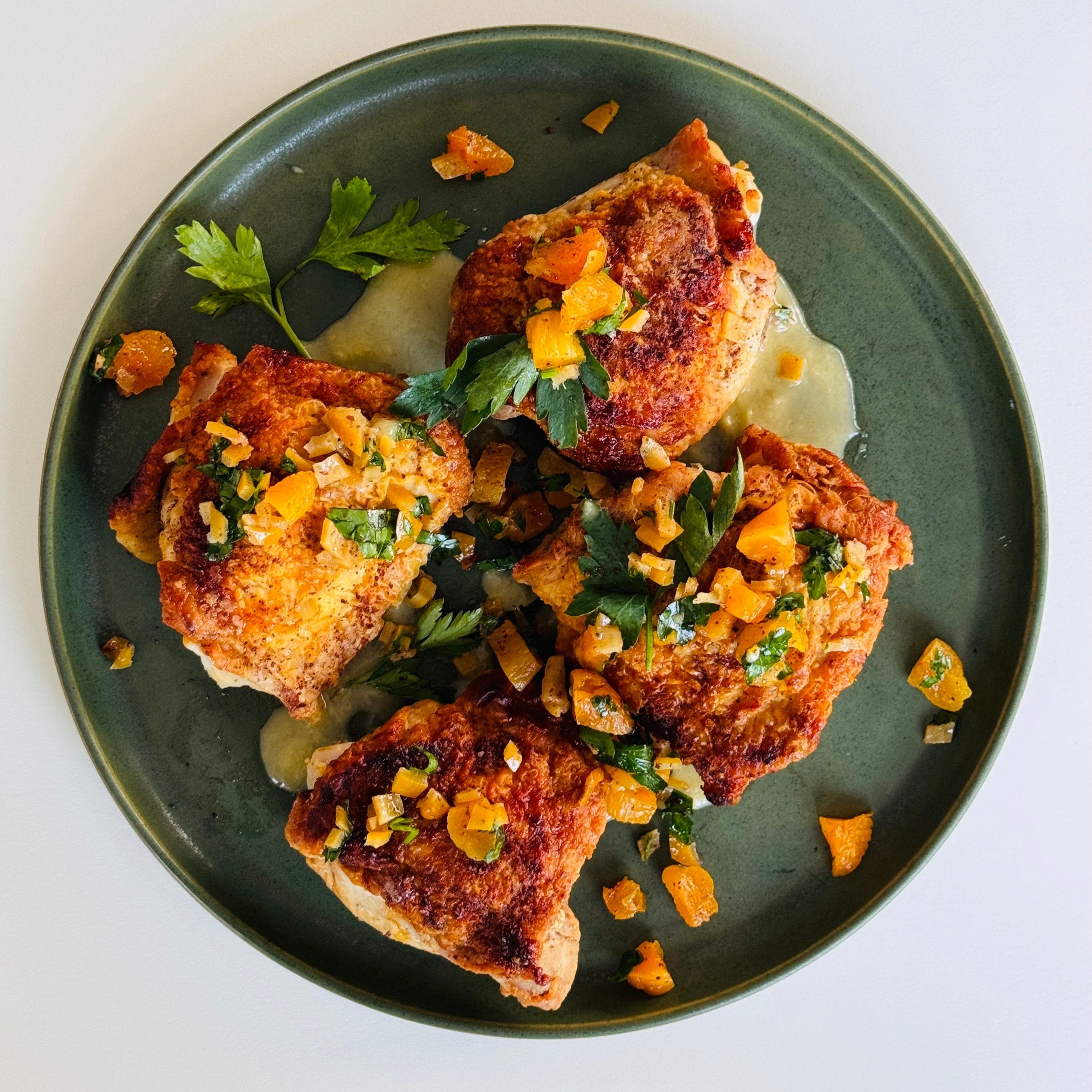 A repeat favorite of ours! Crispy roasted chicken thighs smothered in the most incredible, bright chutney with preserved lemon, dried apricots, sumac, and a touch of honey.