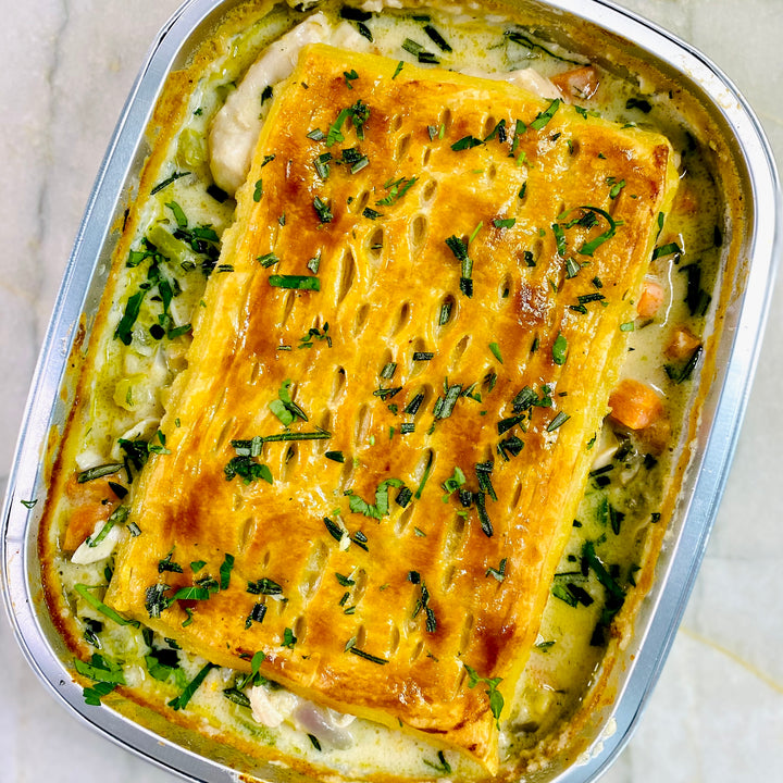 The absolute ideal chicken pot pie: packed with chicken and vegetables, just the right around of creamy, crisp, light puff pastry crust.