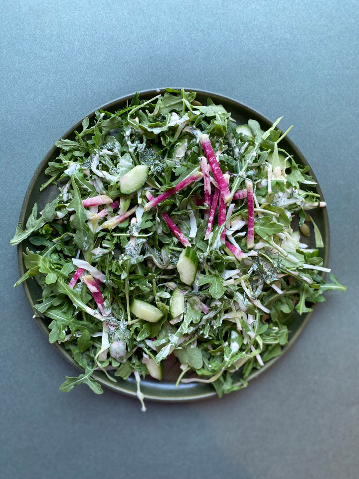 A staple salad, because we could eat it every single day of the week. A super crunchy mix of cabbage, cucumbers, arugula, watermelon radish and pumpkin seeds with our outrageously good vegan ranch alongside.