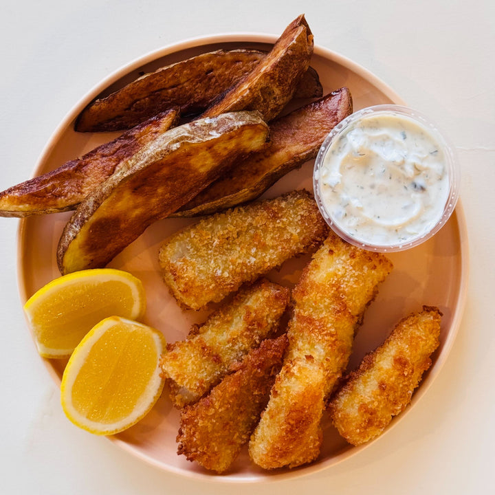 A dish of perfect golden-y brown deliciousness with crunchy panko-crusted cod and roasted potato wedges. Served of course with tartar sauce and lemons for the authentic experience. We love this one as a crowdpleaser for diners both big and little!