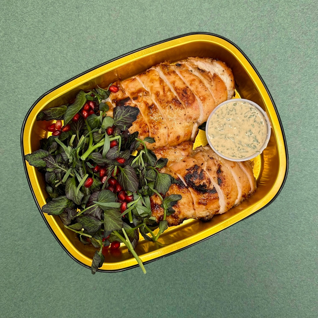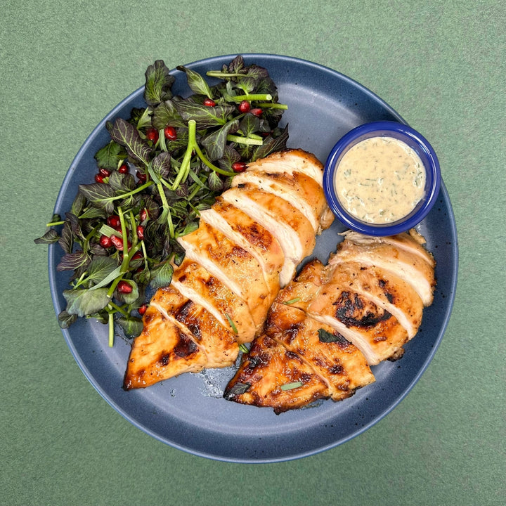 This is The Chicken You Always Want in your Fridge. Boneless, skinless chicken breast with an addictive sauce (two - if you include the accompanying vegan ranch), and gorgeous crunchy watercress salad with pomegranate seeds.