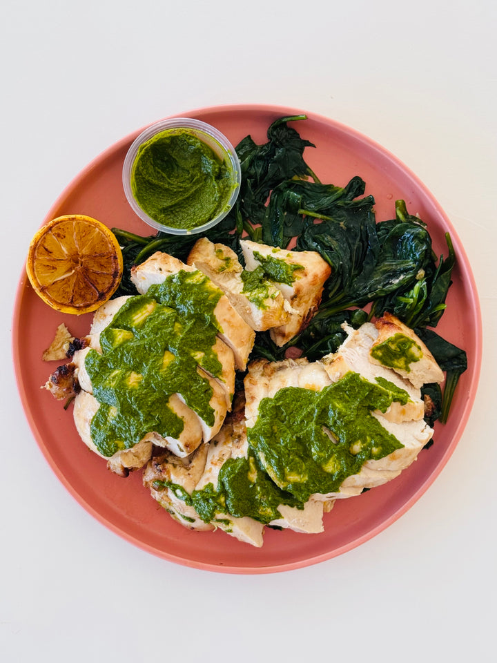 Grilled chicken breast with simply sautéed spinach, charred lemon, and a bright sauce to smother over everything.