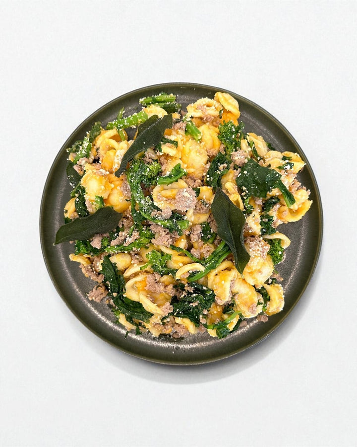 A vegetable forward take on the classic sausage and broccoli rabe pasta, this orecchiette has butternut squash, sage, and a light sauce with Parmesan.