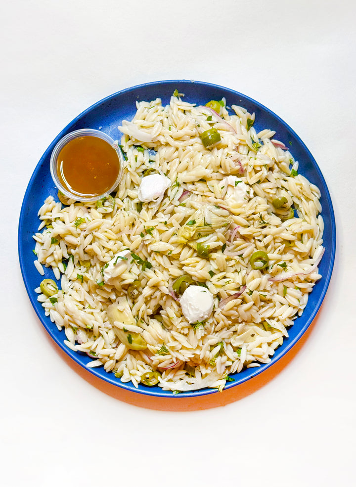 A favorite pasta salad of ours, with orzo, marinated artichoke, fresh mozzarella, and castelveltrano olives.