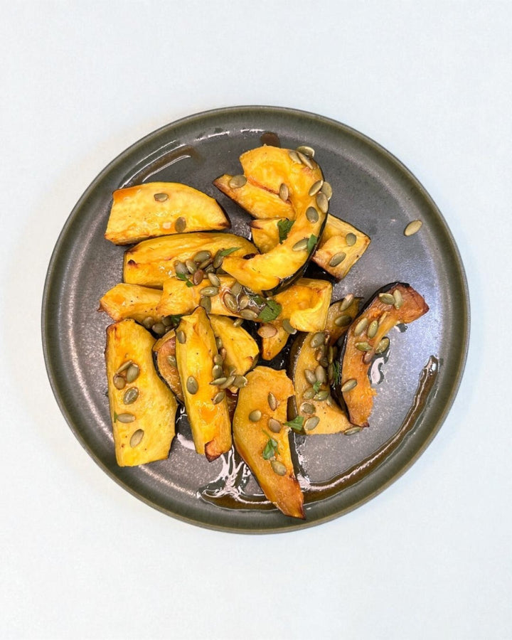 Acorn squash: the one that's at every farmers' market, but just a little too annoying to cook by yourself at home on a weeknight. We're roasting big wedges of one of our favorite squashes, and finishing it with a light honey-soy dressing and a smattering of pumpkin seeds for a simple but flavorful preparation.