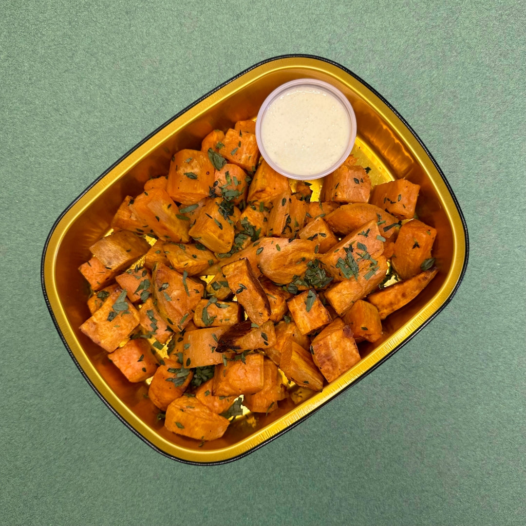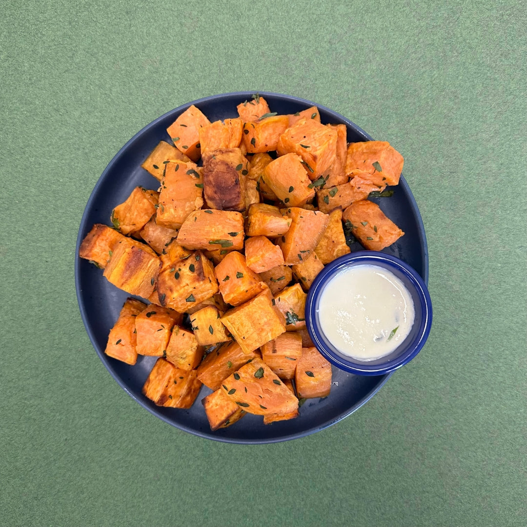 Simply roasted sweet potatoes with thyme, tarragon, and an absolutely delicious whipped feta alongside.