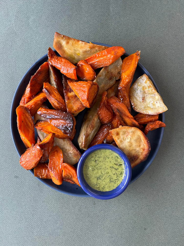 A blend of two of our favorite roots, simply roasted with our classic salsa verde alongside.