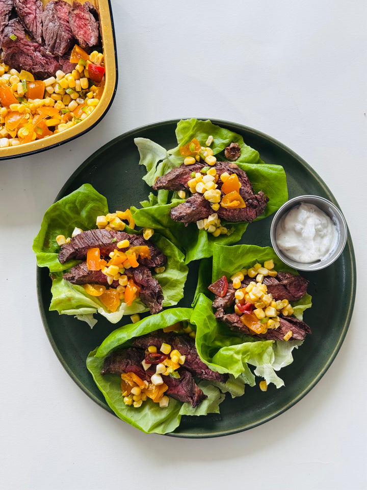 Seared flank steak with a corn and cherry tomato salsa, all wrapped up in Boston lettuce wraps.