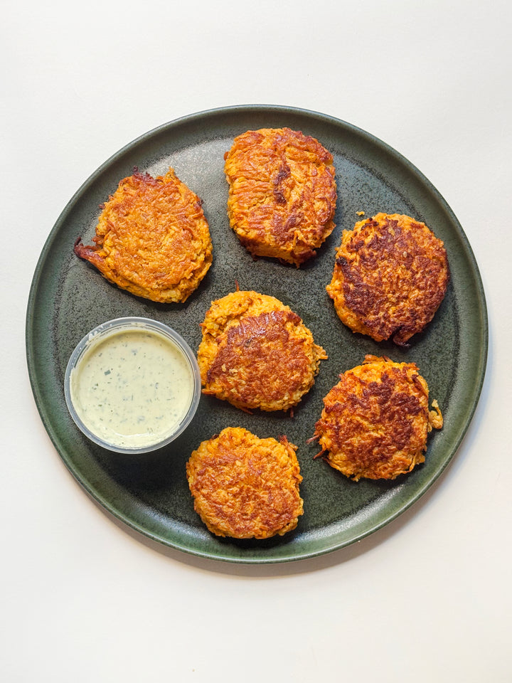 Crispy, cheesy sweet potato and goat cheese cakes with a refreshing herb and yogurt tahini for dipping.