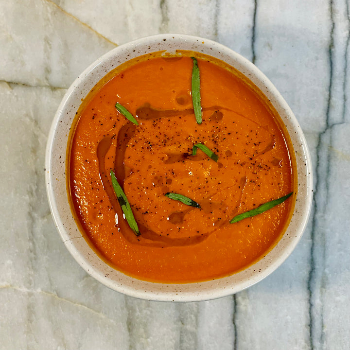 Velvety rich, but vegan! this tomato soup is made simply with fennel, carrot, celery, basil and thyme.