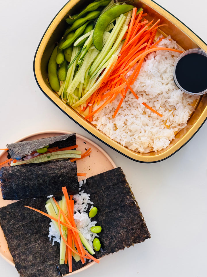 For the aspiring little sushi chefs out there: a dish that's both dinner and an activity. Our DIY vegetarian hand-rolls have sushi rice, carrots, cucumbers, and edamame with nori sheets and soy for the most fun, make-your-own-bite adventure.